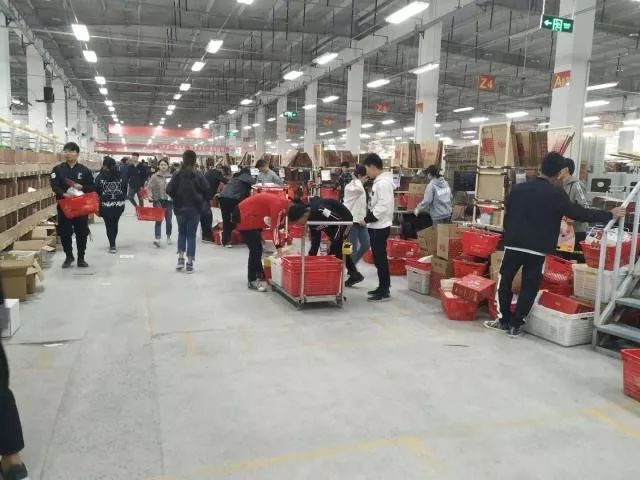 电子商务智能配货中心现场到处是封箱、拉笼车、拣货车的声音,框框当当,奏成双11发货现场一道美妙的音符!