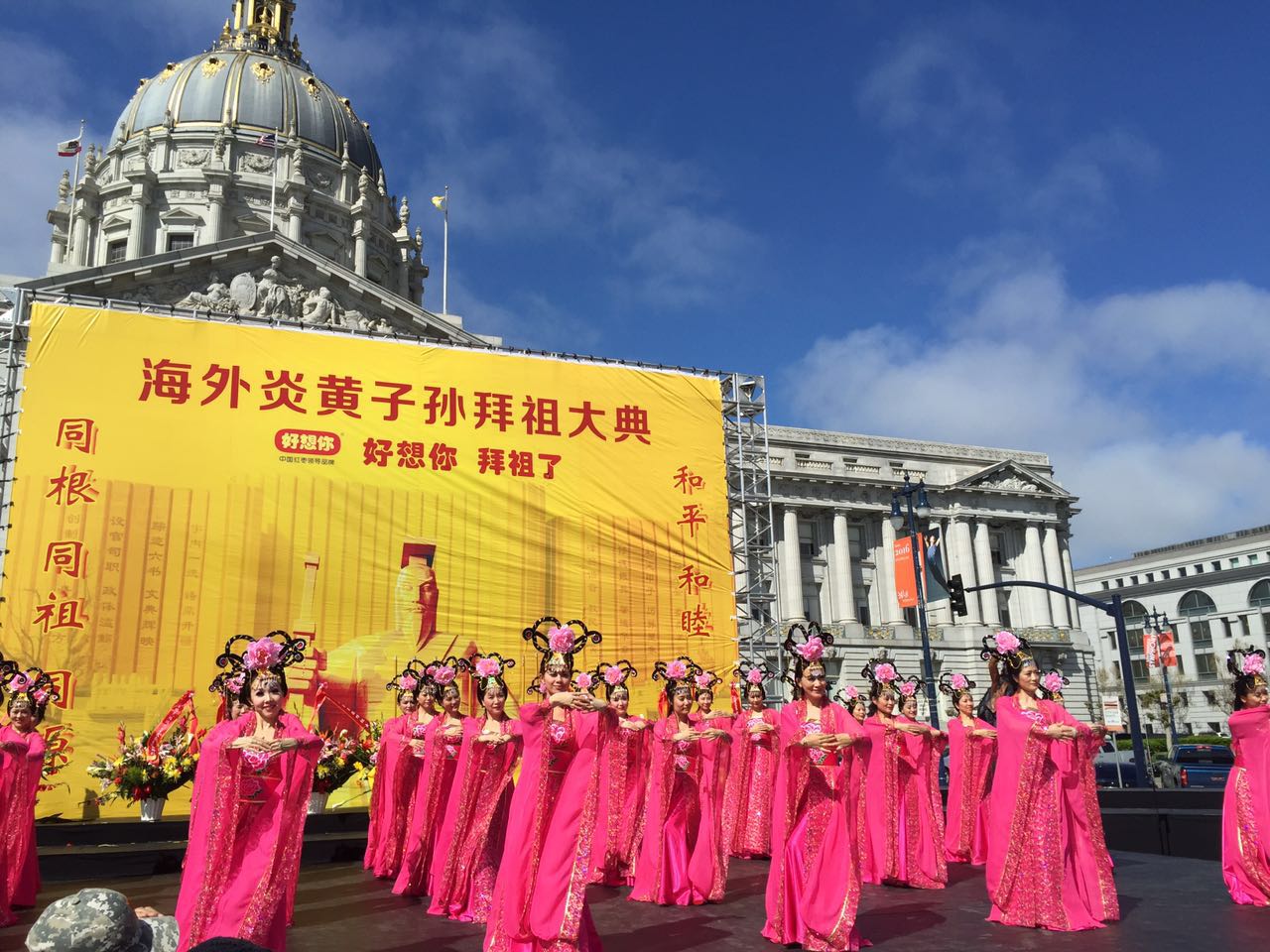 当天上午,上千华人华侨身着正装、佩戴黄丝巾,齐聚旧金山市府广场前,参与由“锣鼓喧天、敬献花篮、净手上香、行施拜礼、恭读拜文、高唱颂歌、乐舞敬拜、祈福中华、列队广场巡游”9项中国古代礼仪组成的大典仪式。整个活动现场庄严肃穆,在场的华夏儿女无不为这一期待许久的时刻而动容。