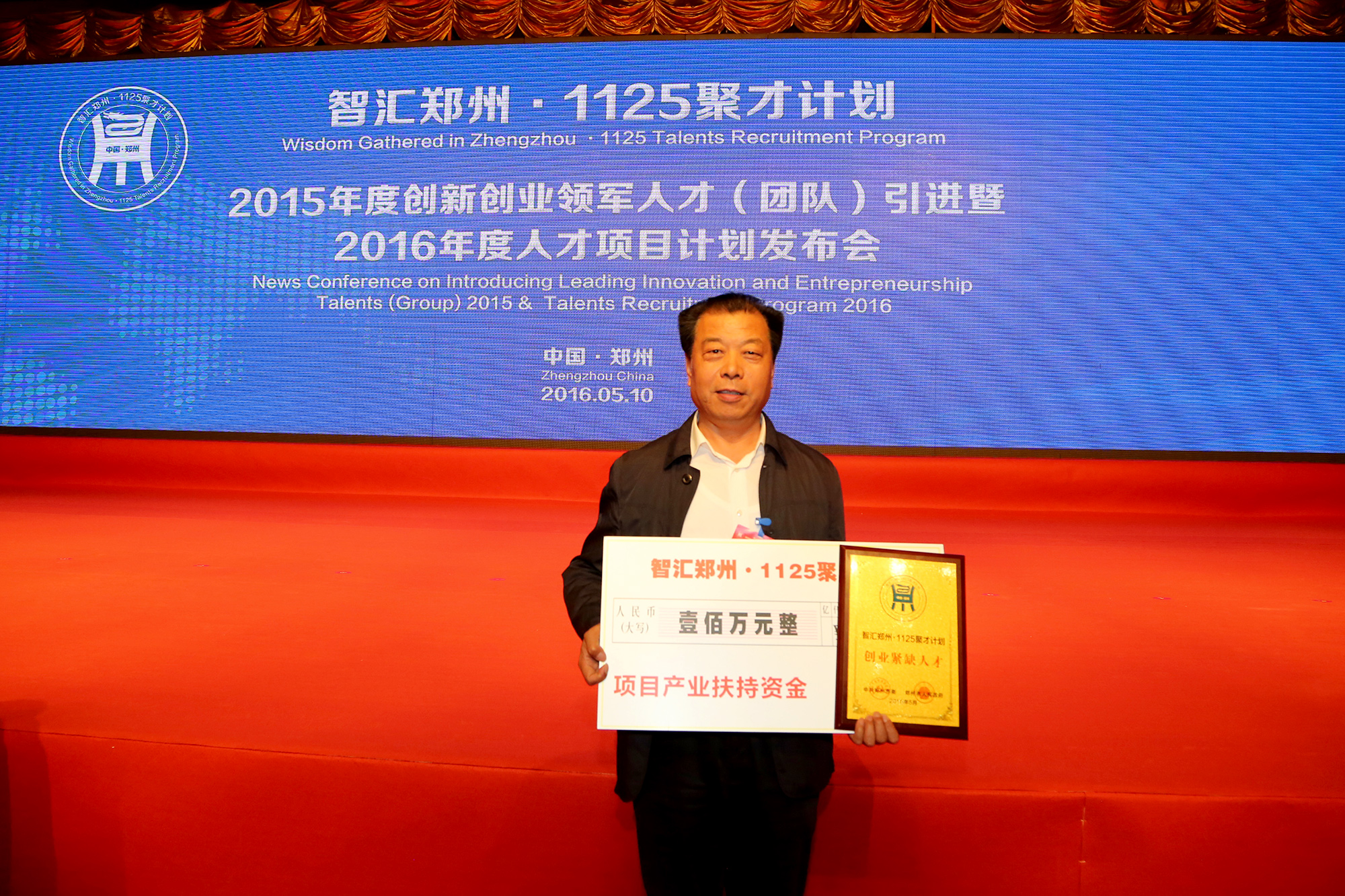 5月10日,“智汇郑州?1125聚才计划”2015年度创新创业领军人才(团队)引进暨2016年度人才项目引进发布会在国际会展中心举行。芒果体育枣业董事长石聚彬荣获“郑州创业紧缺人才“奖,并获得100万元产业扶持资金。