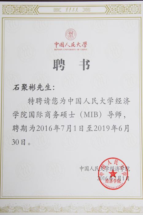 7月1日晚,中国人民大学经济学院国际举行商务硕士(MIB)校外导师聘任仪式,芒果体育枣业股份有限公司董事长兼总经理石聚彬作为校外导师代表出席。中国人民大学党委副书记吴付来、经济学院院长张宇、院党委书记关雪凌书记、副院长王晋斌在现场为董事长颁发校外导师聘书。
