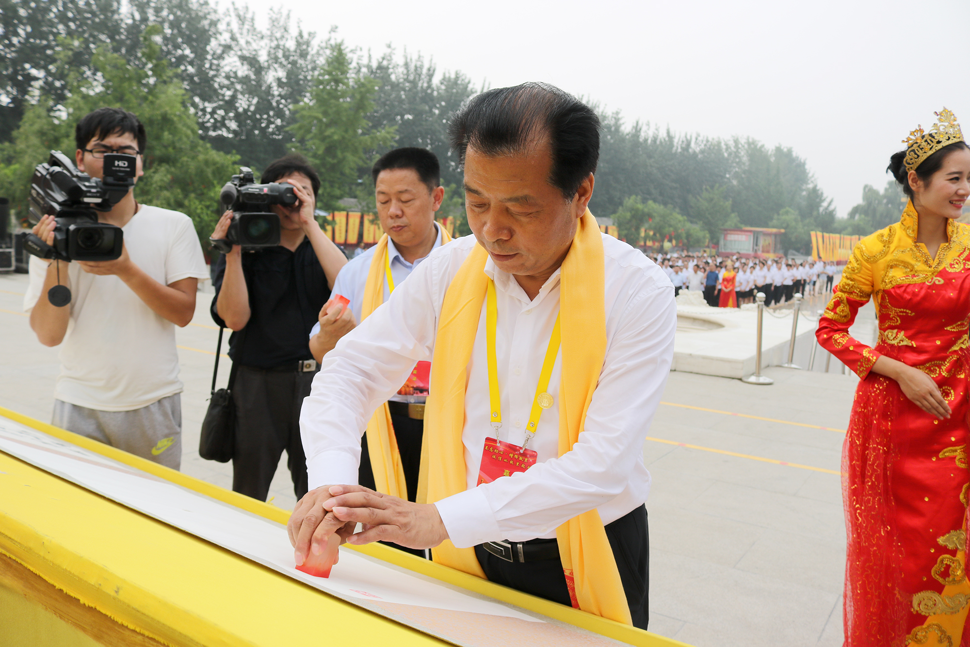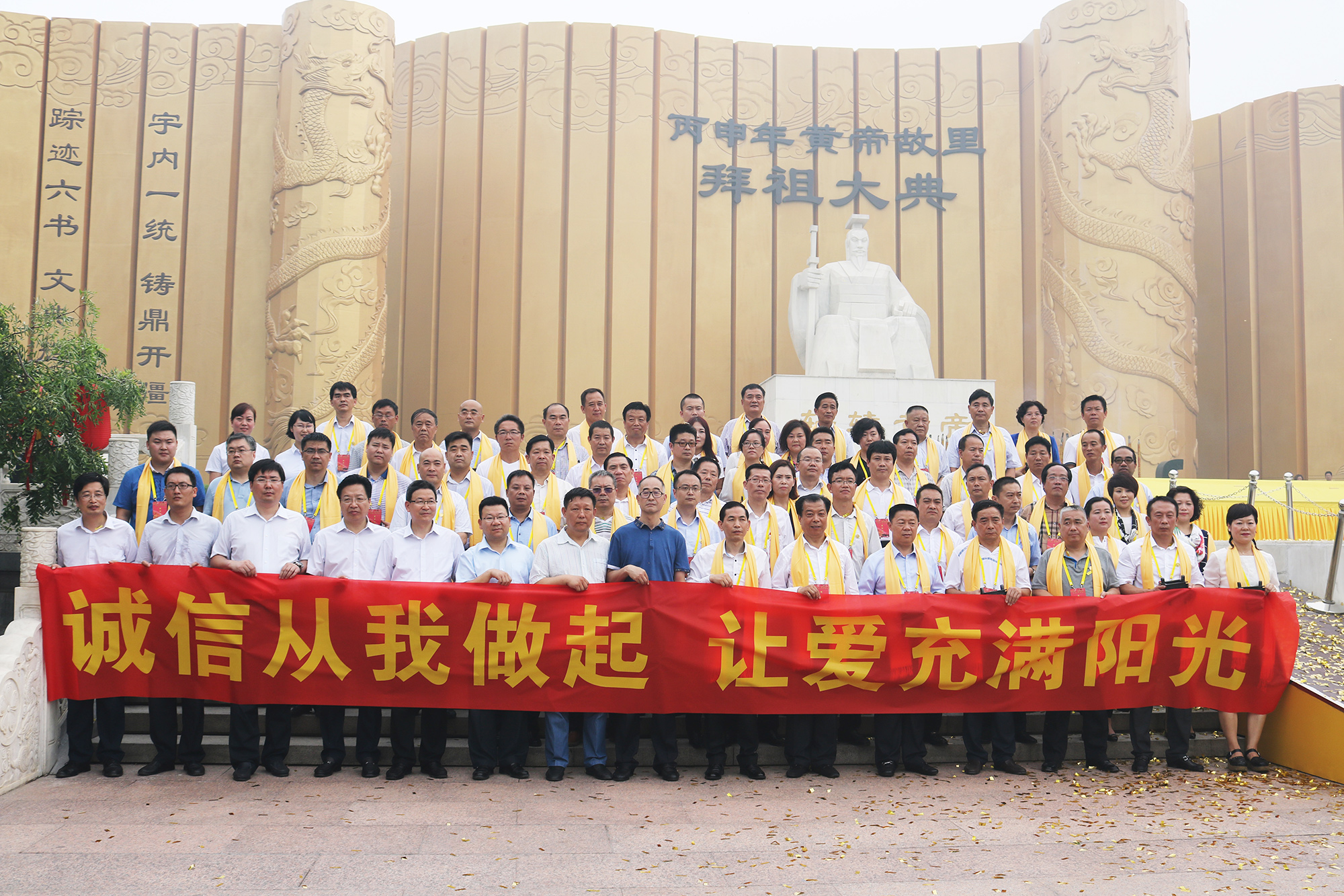 上午9点整,拜祖仪式正式开始,董事长石聚彬及现场59名企业家怀着无比崇敬之情向始祖轩辕黄帝敬香。作为新郑诚信企业家代表,董事长还走上祈福台,领誓《诚信宣言》,现场企业家共同宣读,并在《诚信宣言》的书法长卷上盖上印章,向人文始祖庄重承诺“以至诚之心,待人处世;以至诚之德,律言律行,不忘初心,增辉故里,树立企业诚信形象”。