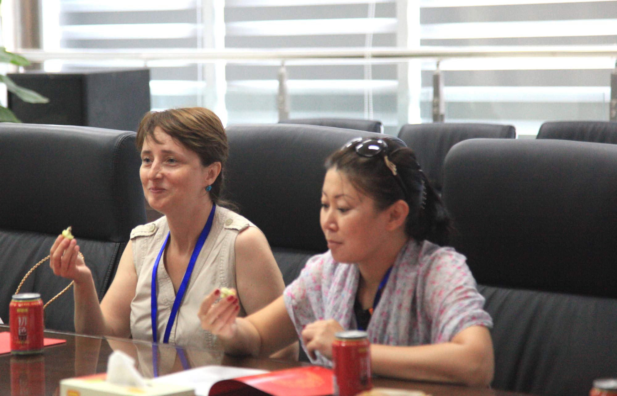 访问期间,恰逢今年第一批鲜枣成熟。在当天下午的座谈会上,果盘里摆放的鲜枣再次抓住宾客们的眼球,他们纷纷拿起品尝,鲜枣脆甜爽口,完全不同于干枣的味道和口感,宾客们咬下一口立刻露出惊喜的笑容,纷纷竖起了大拇指。