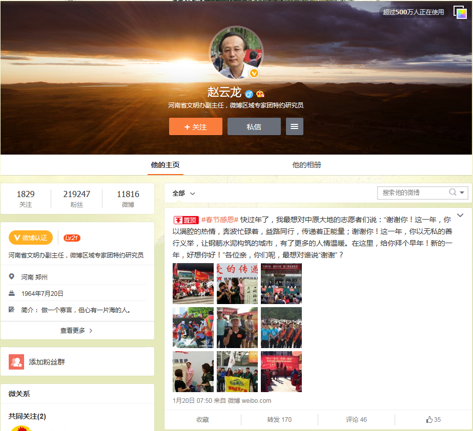 昨日下午,接受大河报记者采访的赵云龙说,他发的微博下面,专门选用了志愿活动的图片,“这些都是过去一年我参与的部分活动”。
