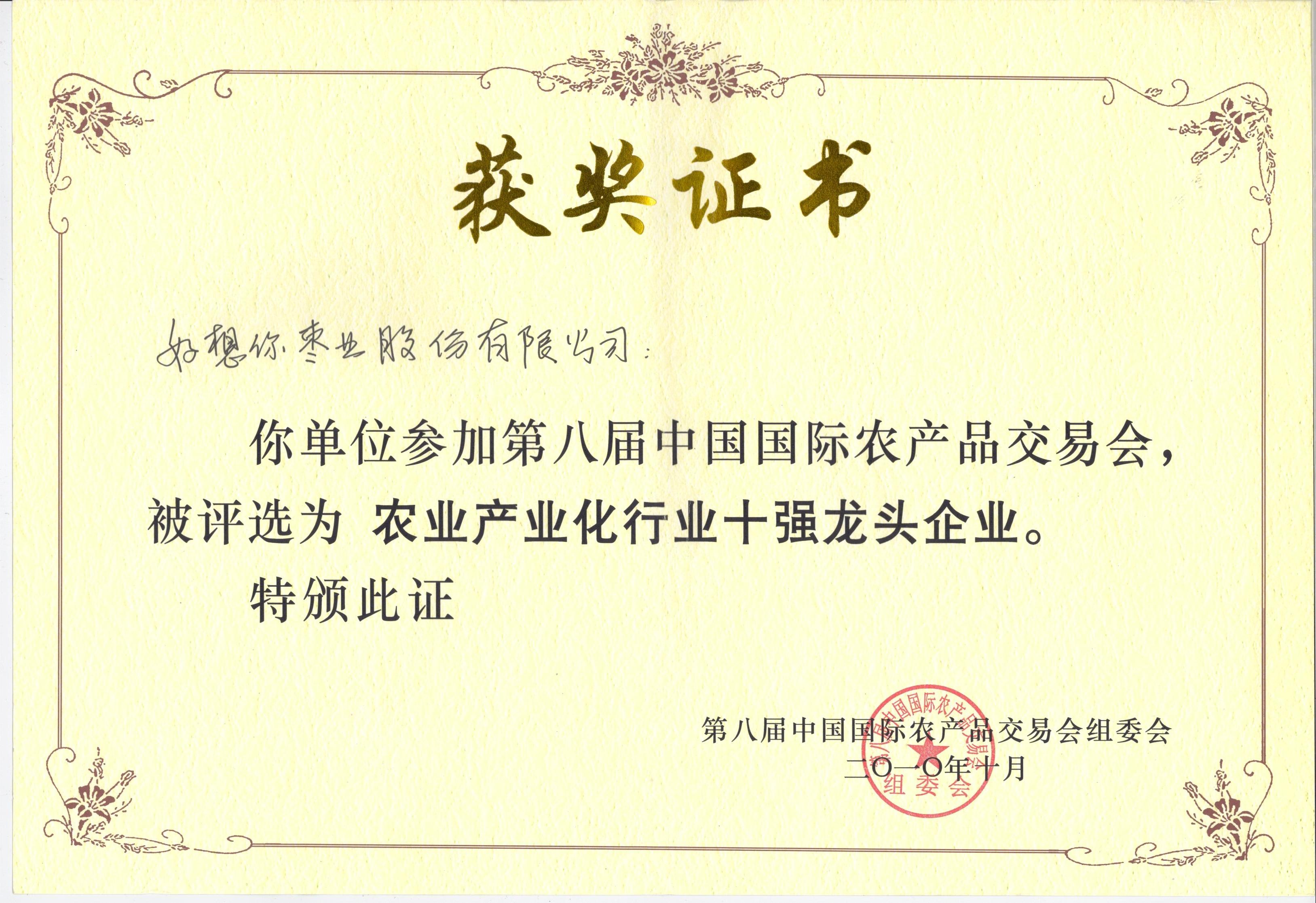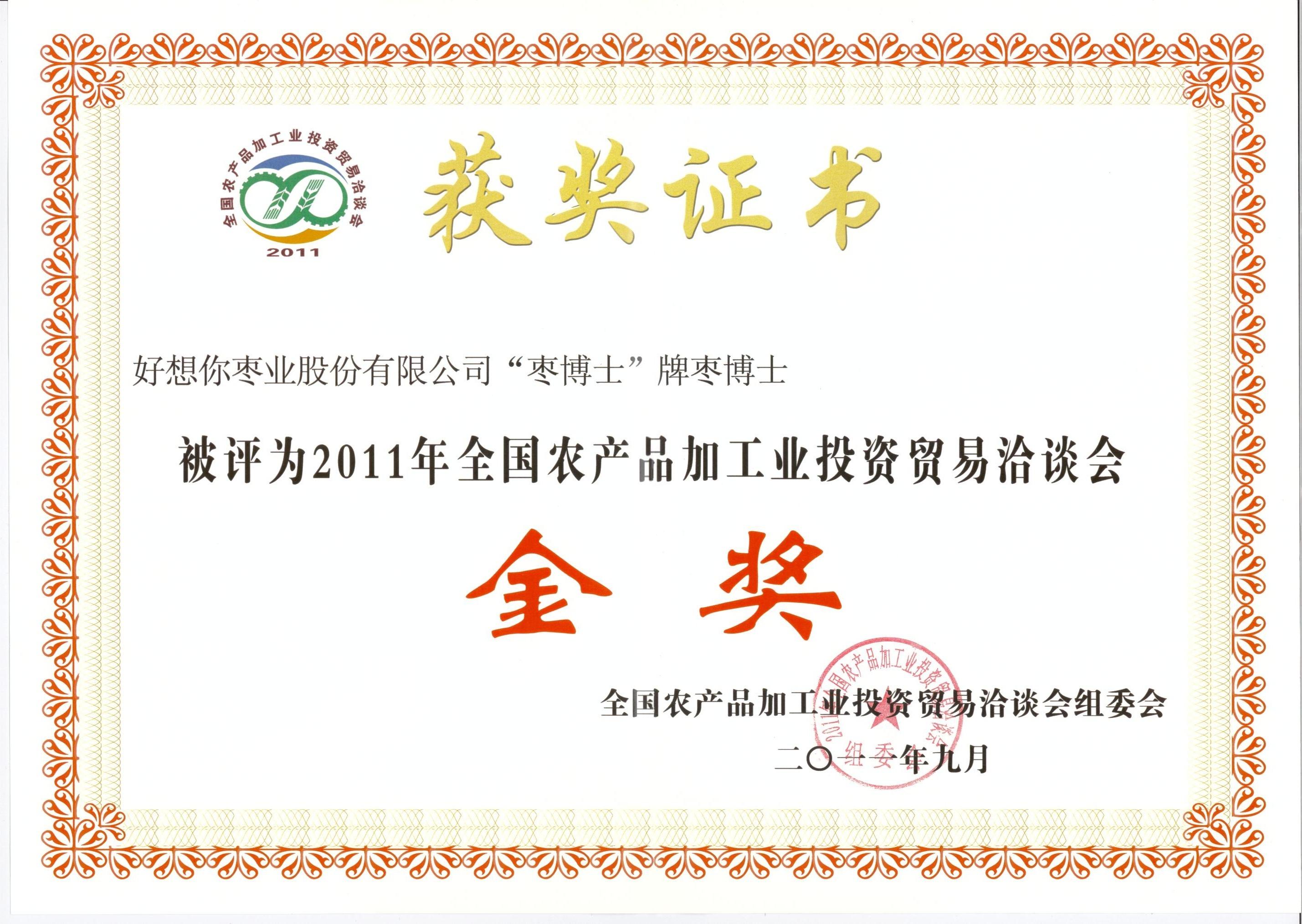 2011年全国农产品加工业投资贸易洽谈会金奖